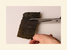 昆布は、乾いた布巾で表面のほこりを拭き、繊維に逆らって切込みを入れておきます。