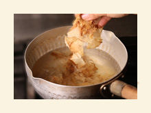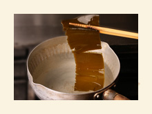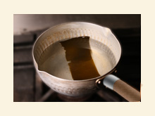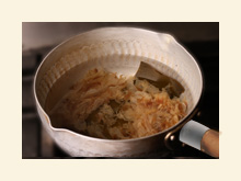1.一番だしをとった後の昆布とかつお節に水を入れ火にかけます。
