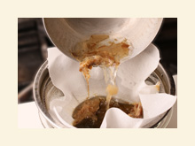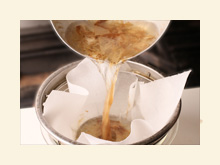 3.かつお節が沈んできたら、キッチンペーパーなどでこします。
